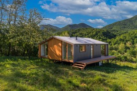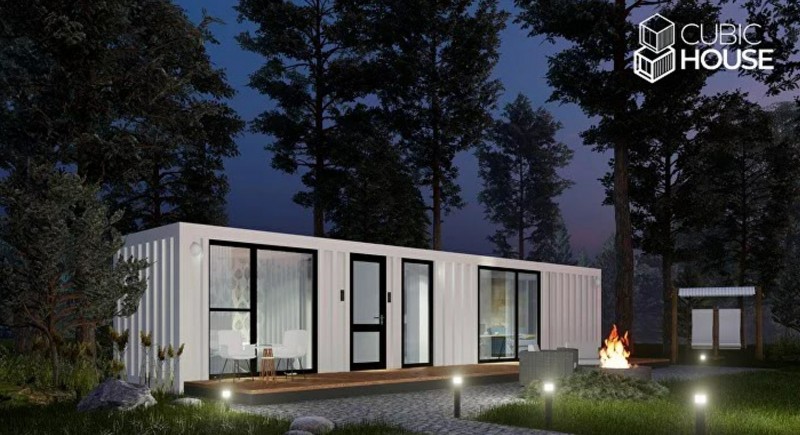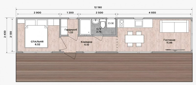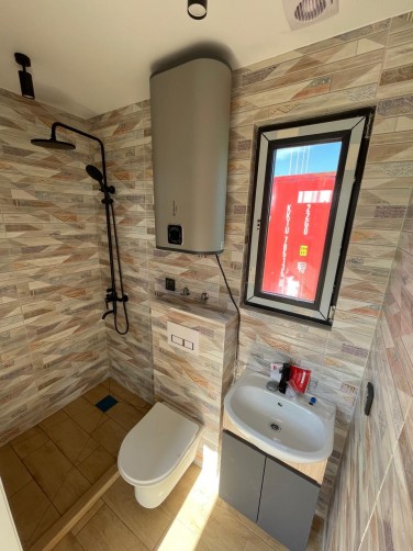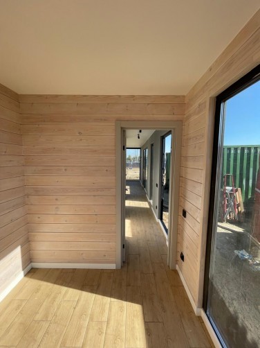 Модульный дом из морского контейнера. Кухня-гостинная и отдельная спальня. Санузел в керамической плитке. Высота потолков 2,4 м