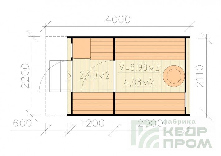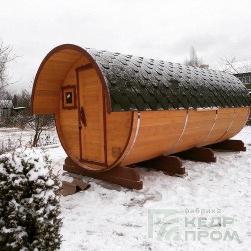 Баня-бочка длиной 4 метра с козырьком над входом, увеличенная длина бани позволяет разместить не только вместительную парную, но и комфортабельную раздевалку или комнату отдыха, в которой комфортно может находиться несколько человек. Одна самых популярных моделей в нашем ассортименте бань.